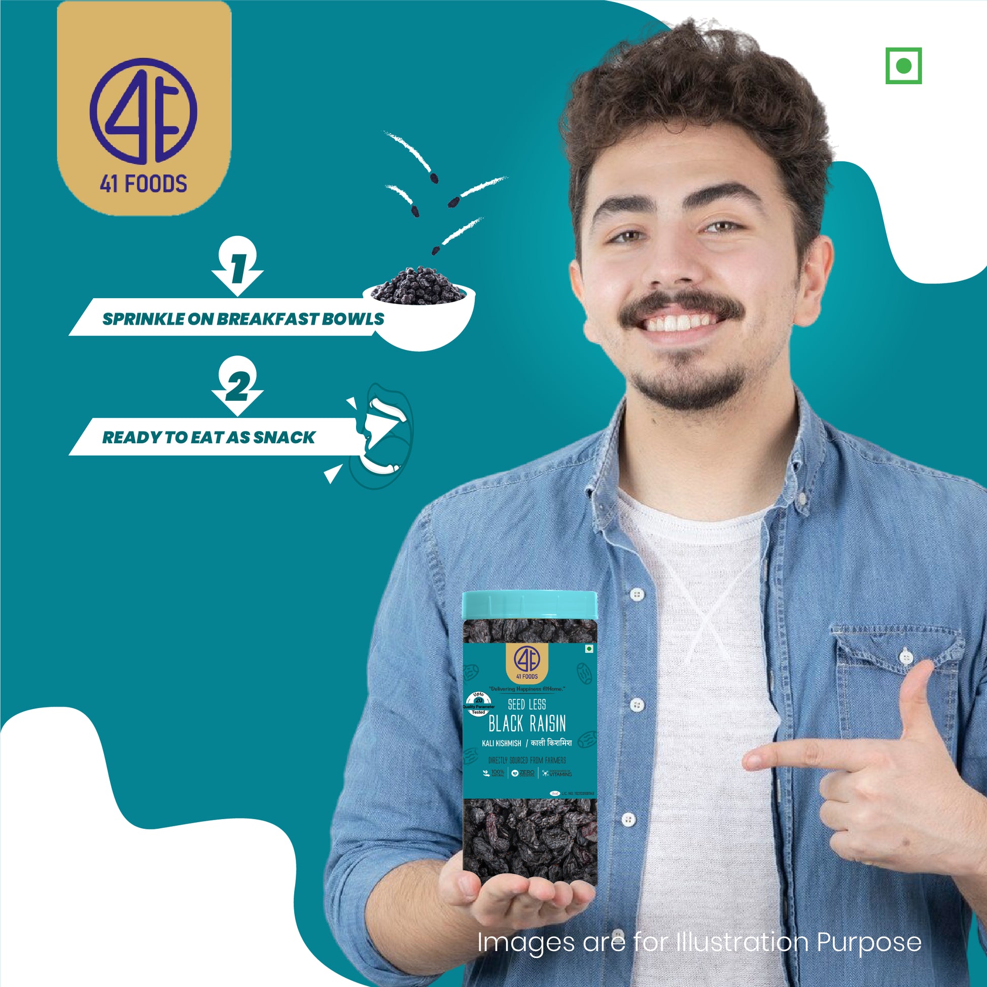 - 41 Foods 100% Premium Black Raisins, Tasty & Chewy: Large in size, the raisins deliver a sweet, fruity flavour with a soft, chewy texture that’s simply irresistible.