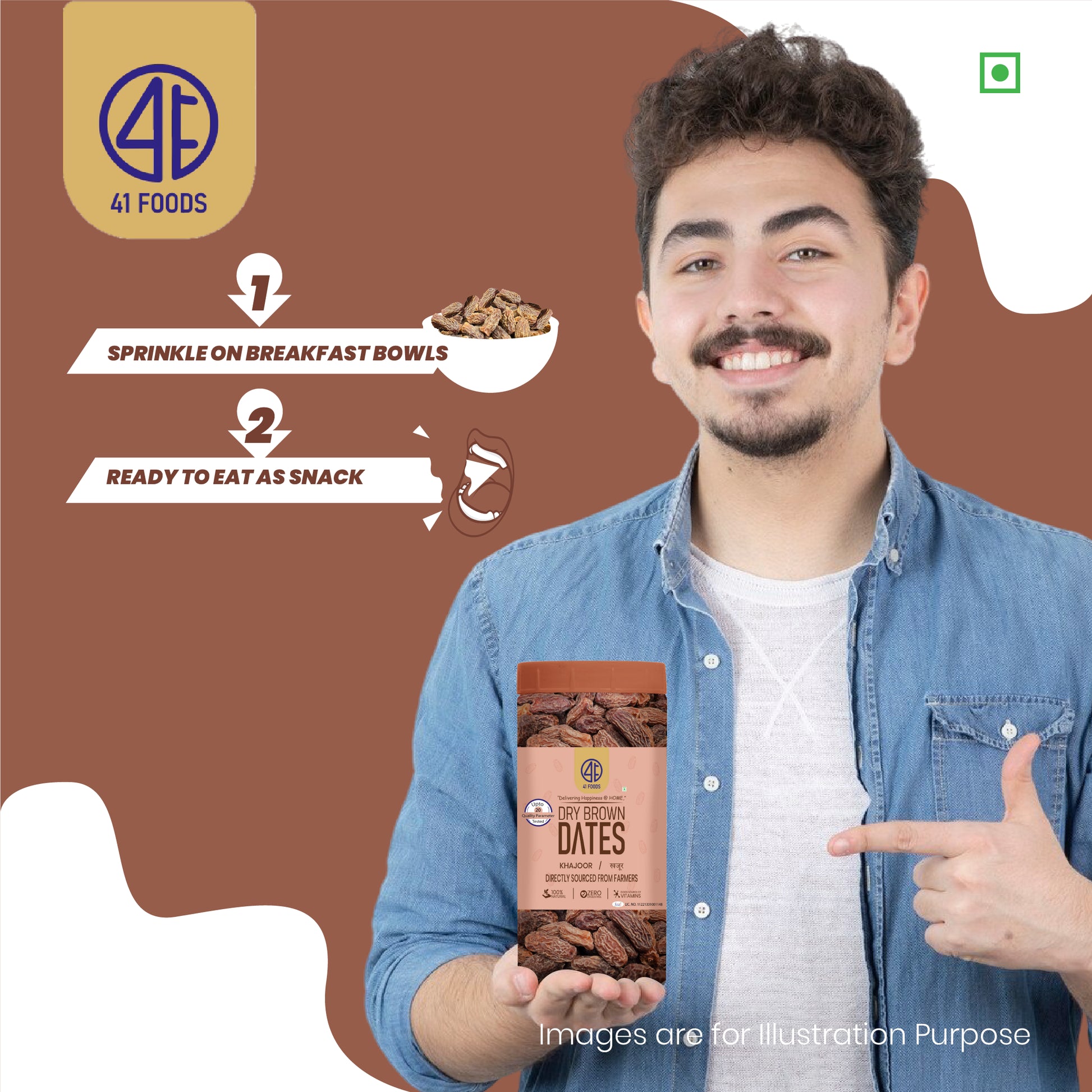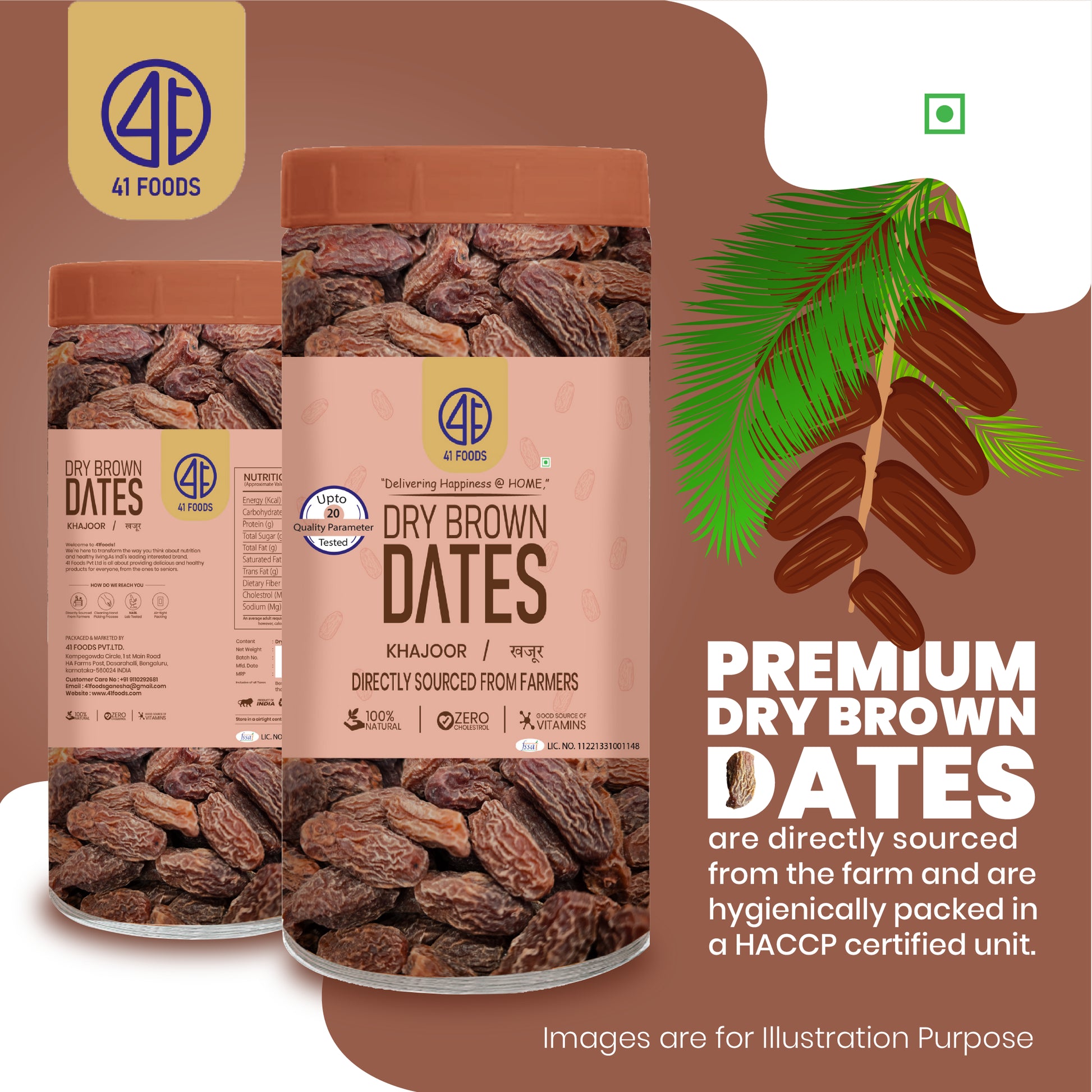 - 41 Foods Premium Brown Dry Dates are procured directly from growers and are processed and packed in our hygienic processing plant to retain their natural freshness, aroma and the original nutrients.