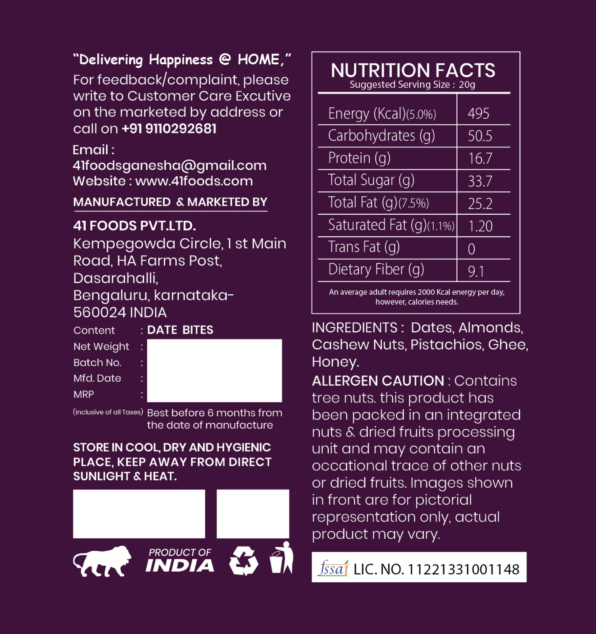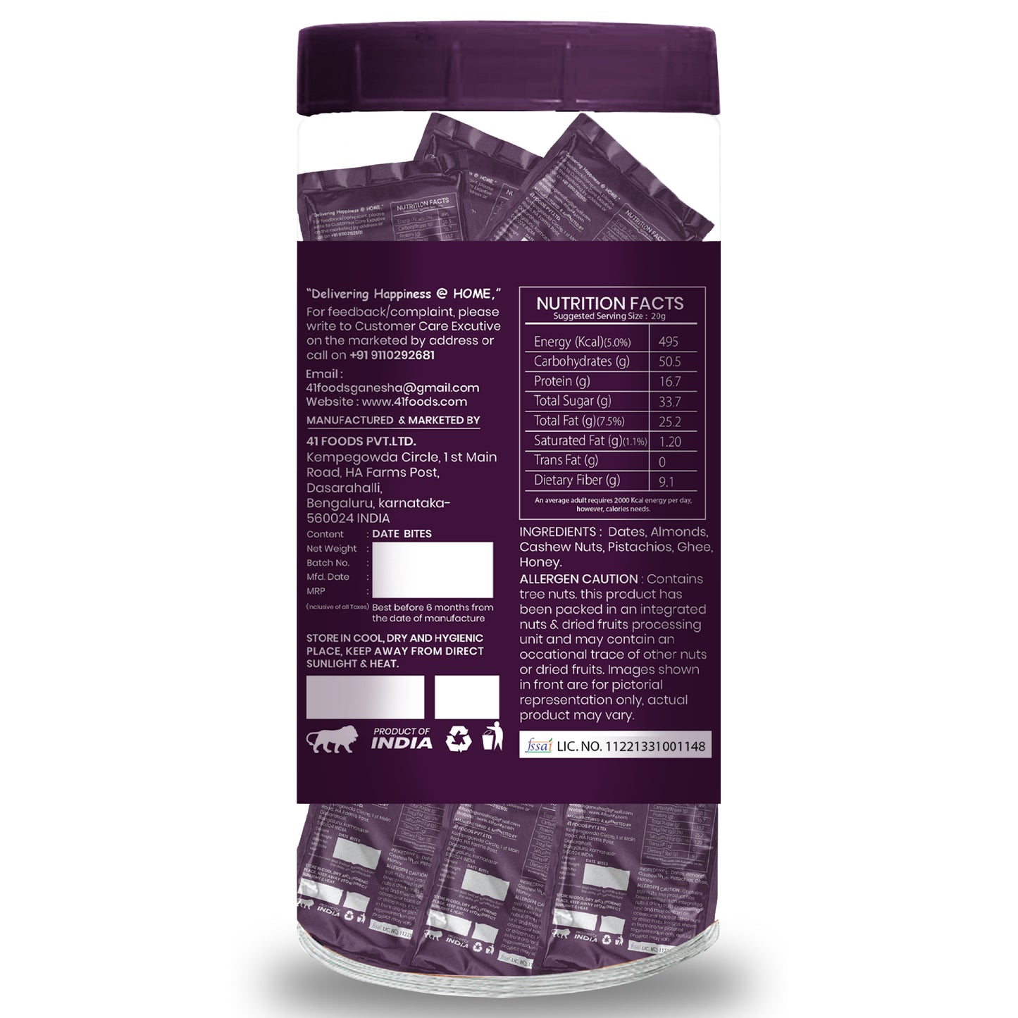 41 Foods 100% Premium Classic Date Bites I Dates Bites Made with Dates, Pista, Cashews, Almonds, Honey and Pure Ghee I Dry Fruits & Nuts, Healthy Snacks, Sweets, Gluten Free, No Added Sugar.