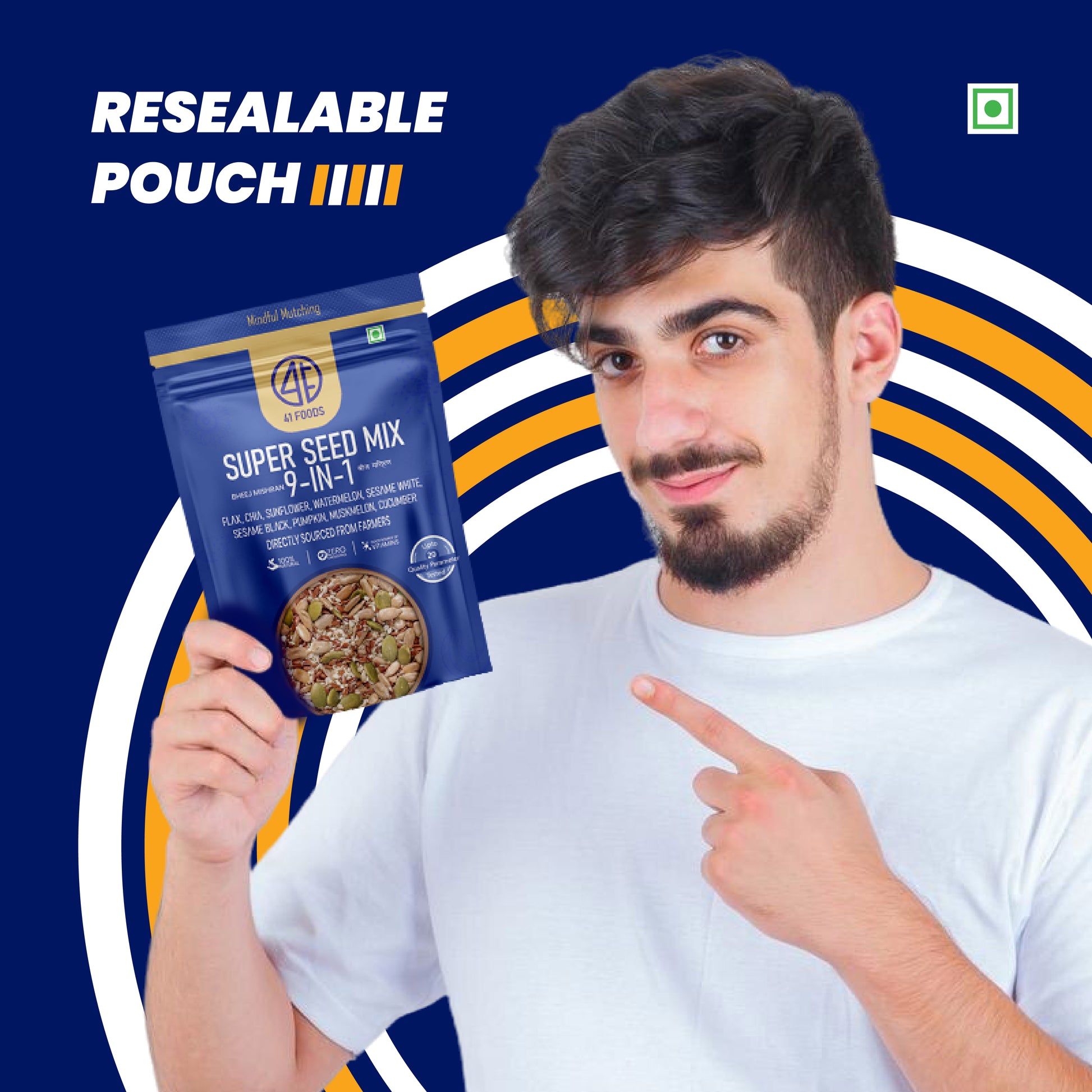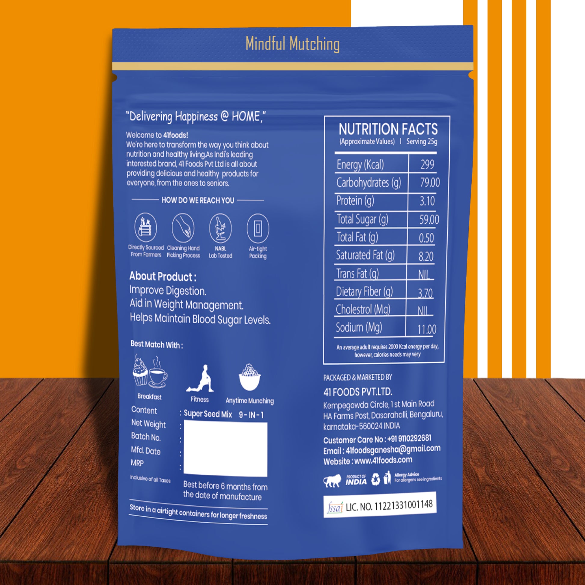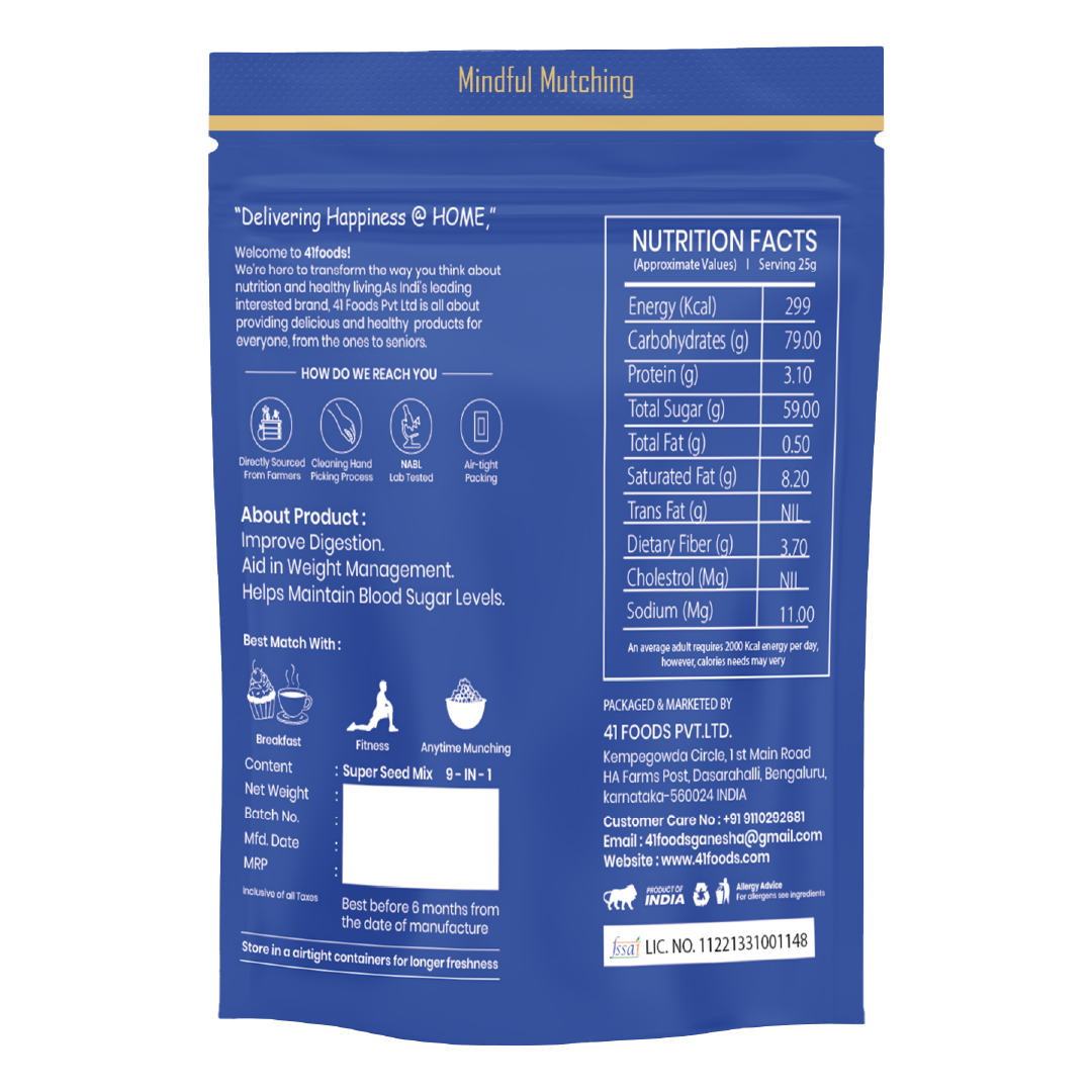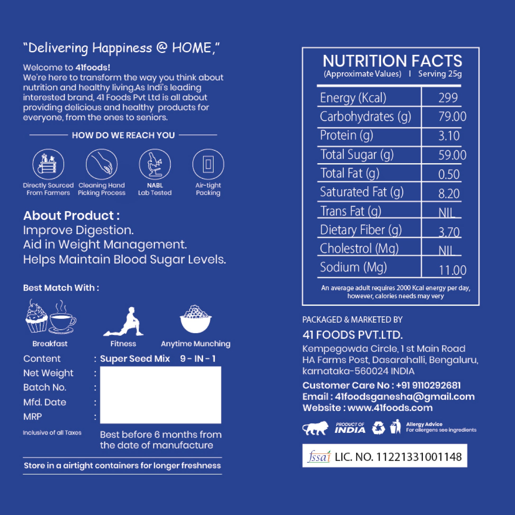 - 41 Foods Seed Mix 9 in one : Zero added sugar ensures blood sugar control. Rich in protein, fiber, omega-fats, vitamins, and minerals for overall health."